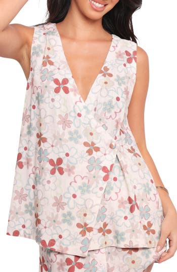 Delightful blooms charm this longline linen-kissed top made with a shaping wrapped front.