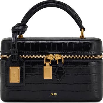 Brushed hardware and geometric zipper pulls highlight the croc-embossed faux leather of a structured train case perfect for stylishly storing your small essentials while on the go. An optional crossbody strap provides hands-free carry.