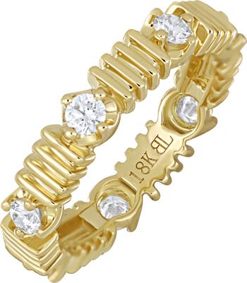 Icy round diamonds and ridged lines distinguish the modern silhouette of this stackable band ring handcrafted in warm 18-karat gold.
