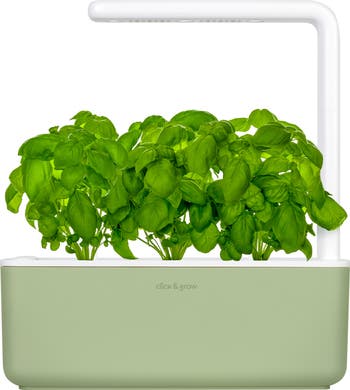 Includes: Base with water reservoir, water level float, LED lamp, three click-in plant cups, three clear dome germination lids, three plant collars, three basil starter pods, quick start guide.