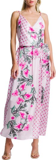 This wrap-style dress painted in a patchwork floral print is tethered with narrow adjustable straps and cinched at the waist with a flowy sash.
