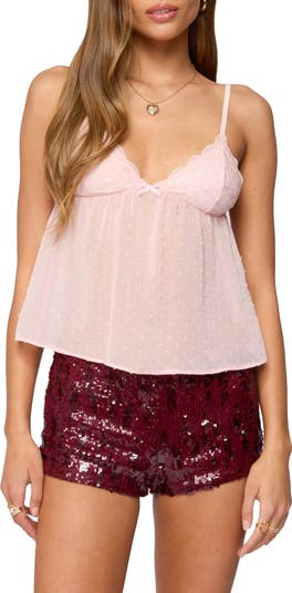 Clip-dot chiffon brings soft movement to this babydoll-style top made with soft lace cups for a touch of romance.