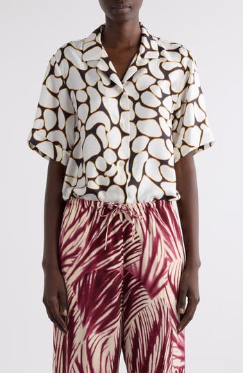 The iconoclastic Belgian designer's eclectic color/print/texture fusion lives on in this fluid silk camp shirt patterned in abstract orchid petals.