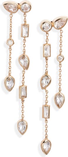 Multishaped diamonds and white topaz alternate, illuminating these double-chain drop earrings forged from 14-karat gold.