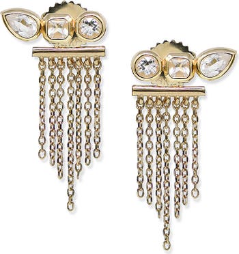 Streams of chain fringe dangle at the back of your lobe on these handcrafted crawlers anchored by mixed-shaped topaz bezels.