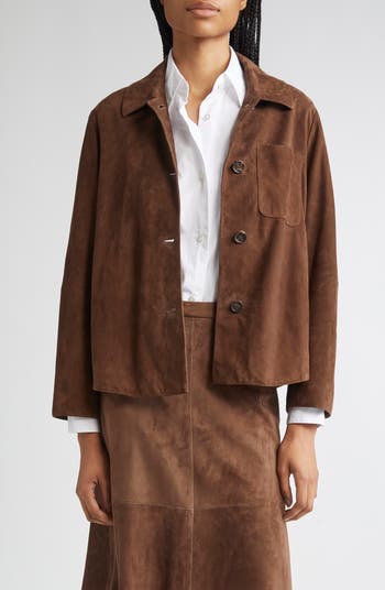 A utility-inspired shirt-jacket cut in a boxy silhouette gets a luxurious update from lambskin suede construction and a silk lining.
