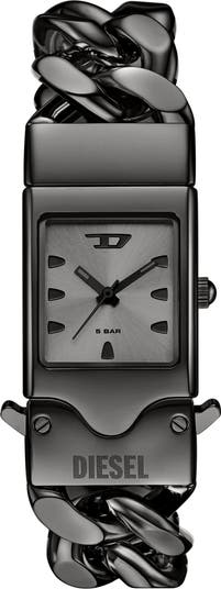 Sleek, industrial aesthetics inform the look of this stainless steel tank watch set on a curb-chain bracelet with a double-deployant clasp closure at the base of the case.