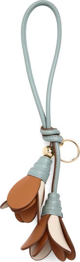 This softly hued leather bag charm from the spring '26 collection features a flower-petal design and engraved logo on the gleaming, golden bead. It can also be used as a key ring or worn as a knotted wristlet.