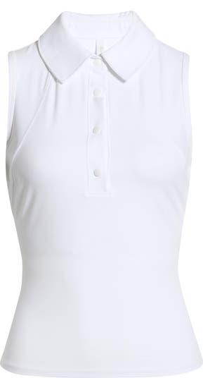 Soft and stretchy, this figure-sculpting sleeveless top is updated with a sporty polo collar.