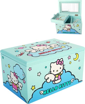 Officially Licensed Hello Kitty Accessories: Hello Kitty jewelry holder is crafted from wood with a hinged top opening. Hello Kitty cloud design adorns the exterior Roomy Interior: Jewelry box for women includes a mirror on the inside lid and jewelry storage on the top and bottom. Static top tray is designed to store rings and removable top tray reveals the remaining storage underneath Hello Kitty Vanity: Small jewelry box fits well on a nightstand, desk, dresser, or vanity. These jewelry boxes & organizers are useful Hello Kitty items for storing rings, earrings, bracelets, necklaces, and keepsakes