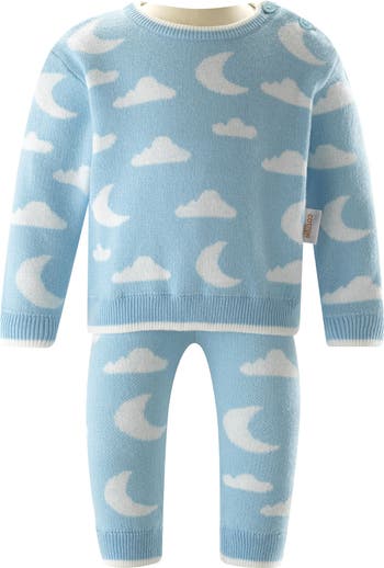This cute blue intarsia knitted set makes the perfect baby boy outfit! This matching set includes a knit sweater and leggings. Button closure on the shoulder and trousers with elasticated waistband makes this a stylish and comfortable outfit.