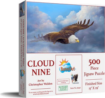 Ascend to new perspectives with the enchanting Cloud Nine 500 Piece Jigsaw Puzzle. Showcasing Christopher Walden's stunning depiction of an eagle soaring amidst a dreamy clouded scene, this tranquil 15" x 29" puzzle invites you to immerse yourself into a calm yet captivating escape. Artfully crafted in the USA by SunsOut Puzzles with a meticulous attention to detail, each piece interlocks flawlessly, creating an endearing display of vivid colors and intricate nuances. Constructed using eco-friendly, recycled cardboard and soy-based inks, the puzzle is designed to be both resilient and environmentally conscious. This peaceful jigsaw puzzle delivers a welcome respite from the everyday, as the birds and clouds take form and provide an intimate connection to the cheering beauty of nature. Purchase with confidence, backed by SunsOut's reassurance of availability of replacement pieces and their unwavering commitment to quality, as demonstrated through their woman-owned small business. This stimulating challenge is not just an idle pursuit; it's a genuine retreat into tranquility, serving as the perfect gift for both art enthusiasts and nature lovers, or as a worthy addition to one's own puzzle collection. Elevate your leisure time with the Cloud Nine puzzle, a serene step towards relaxation and fulfillment.