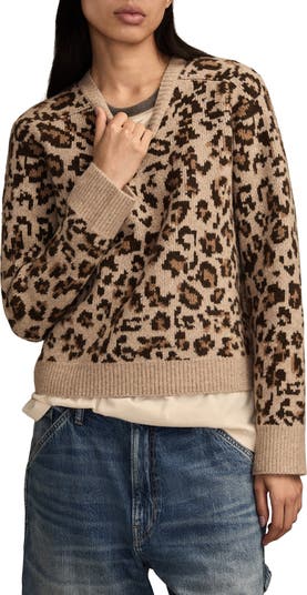 Striking animal spots embolden this cozy crewneck sweater anchored by solid ribbed trim.