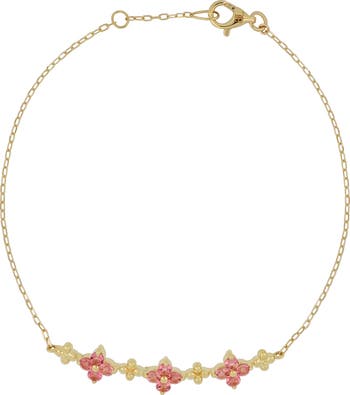 Round pink tourmalines enhance the natural beauty of this delicate clover bracelet handcrafted from 14-karat gold.