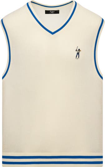 This classic sweater vest detailed with contrast stripes and a golfer appliqué is a perfect layer while you are out on the coure.