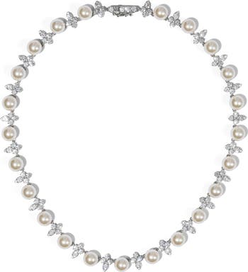 Top ensembles in shine with this vintage-inspired collar necklace that alternates cubic zirconia clusters and faux pearls.