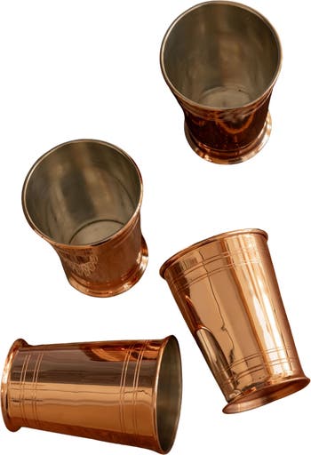 Inspired by the Art Deco eraRaise a glass to timeless style with our Vintage Copper Cocktail Tumblers, a set of four inspired by the clean lines and bold elegance of the Art Deco era. Tin-lined for safe drinking, these tumblers offer just the right weight and sparkle for cocktails, sparkling water, or whiskey on the rocks. Each one brings a dash of vintage sophistication to your bar, with a shape that feels as good in the hand as it looks on display. Dimensions: 3.25" Diameter x 4" H At Coppermill Kitchen, we handcraft vintage-inspired copper drinkware that fuses historical beauty with everyday function. Style on a mirrored tray or serve with fresh citrus slices for a striking presentation. Hand wash and dry immediately to preserve the finish and tin interior.