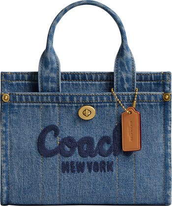Signature logo embroidery brands a denim tote fitted with easy top handles and a detachable webbing strap for versatile wear.