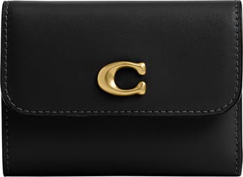 Iconic logo hardware gleams against the supple leather exterior of a compact wallet packed with multiple slots and a removable card case for easy organization.