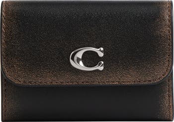 Polished logo hardware highlights the grained rub-off leather exterior of this trifold style that holds essential cards plus a bit of currency via organizational pockets and a removable card case.