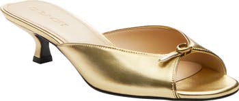 A signature sculpted C tops the curvaceous strap that shapes the chic silhouette of this kitten-heel sandal made from shiny metallic leather.