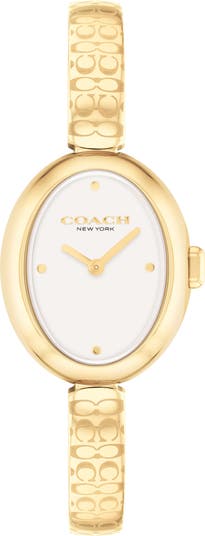A stunning oval dial marked with four dot indexes brings a clean, minimalist aesthetic to a poised timepiece set on a slender, logo-debossed bracelet.