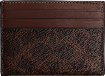 Polished pebbled leather accents the six card slots of a coated canvas card case that's tastefully embossed with COACH'S distinct monogram logo.