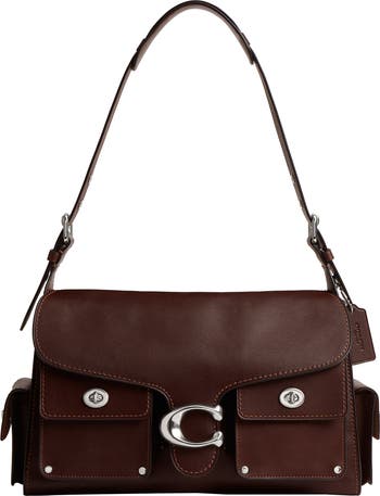 Gleaming hardware and full-grain leather highlight the structured profile of a spacious shoulder bag designed with a multitude of pockets for enhanced organization. A pair of removable straps adjust for versatile wear.