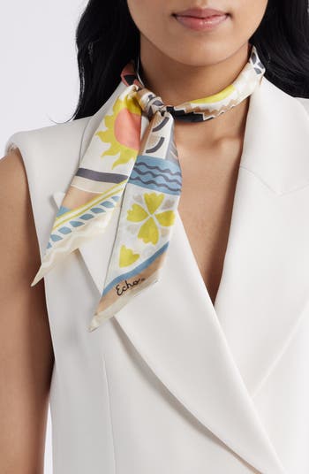 A collage of patterns bring a whimsical aesthetic to a slender silk scarf that will put the finishing touch on your standout looks.