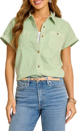 Cooling breezes await you in this vacation-ready shirt cut from breathable cotton and finished with cuffed short sleeves.