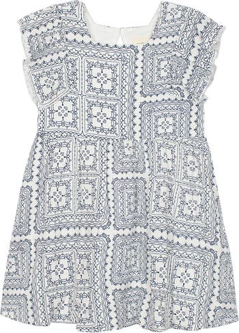 Lovely girl's dress showcasing a delicate blue and white patchwork pattern. Made from lightweight fabric, it features flutter sleeves and a gathered neckline for an added touch of grace. The A-line silhouette provides a comfortable fit, with a convenient back zipper closure for easy wear. Ideal for both special occasions and everyday adventures.