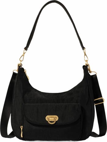Made with convertibility in mind, this style can be worn as both a crossbody or a half moon shoulder bag. A sleek flip lock closure keeps the RFID-protected front wallet secure, and the adjustable crossbody strap helps you achieve the perfect fit. Exterior dimensions: 11”w x 10.4”h x 4”d, 1 lb.