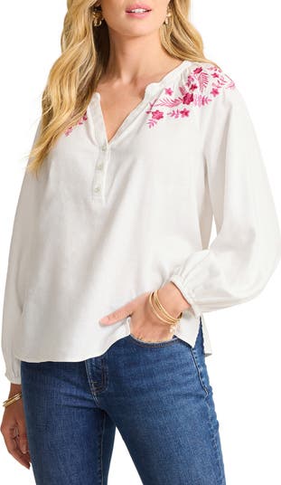 Soft gathers enhance the blousy fit of this peasant top cut from a breezy linen blend and accented with charming floral stitching.
