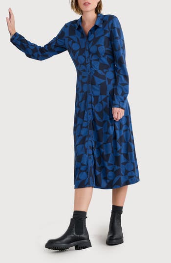 Sharp skirt pleats enhance the flared silhouette of this shirtdress made from modal-softened organic cotton and sweetened by a chic geometric print.