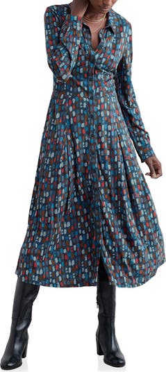 A delightful allover abstract print charms this polished shirtdress made with a fitted bodice and a perfectly flared skirt.