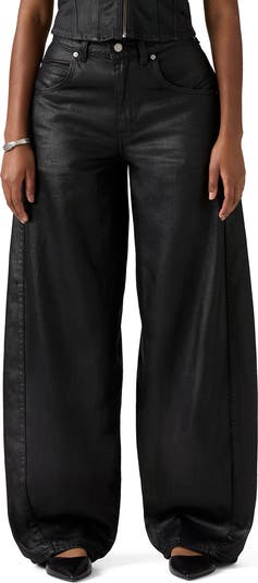 Add drama to denim days with these baggy, nonstretch jeans sporting a sleek black coating, dropped front pockets and curved, full-length barrel legs.