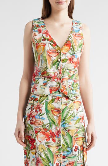 Colorful cocktail illustrations mingle with vibrant botanicals on this summer-ready vest cut from lightweight linen with a deep V-neckline.