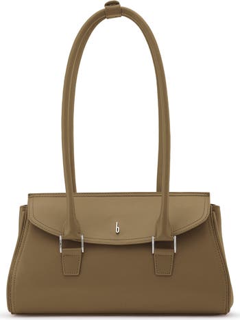 Simple branding and polished hardware reflect off the smooth leather construction of a shoulder bag done in a trendy baguette silhouette.
