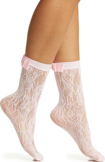 A neat bow trims the back of stretchy lace socks that are meant to be seen.