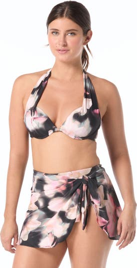Support with a little lift of the girls for a customized fit. Feel secure and sexy with this push up bra sized bikini top. Designed specifically for each cup size so it's a comfortable swim top that fits perfectly. Dark, feminine, florals adds sophistication to this halter bikini top.