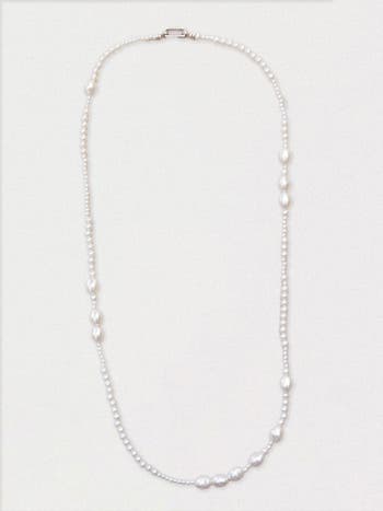 The COCO necklace is hand-strung with a mix of freshwater pearls and finished with a sleek silver clasp. Designed to be worn long or doubled for a layered look, this versatile piece brings effortless sophistication to any outfit.