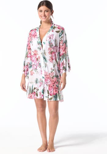 A coverup dress in a romantic floral print that's easy packable and effortlessly charming. Ruffles add a playful pop to the hems. A lightweight mesh fabric is breathable so you can wear it to your hottest destination. Pair it with coordinating printed or solid swimsuits.