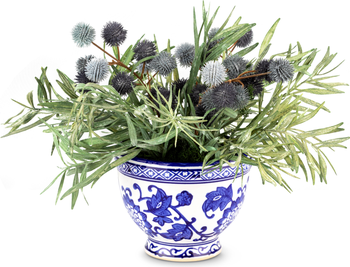 Charming and natural, the Elowen Thistle Toile Bowl Arrangement features rounded blue thistle and luxuriant greenery, carefully arranged to create a balanced and organic aesthetic. Set in a beautifully detailed toile bowl, this arrangement brings a timeless, rustic appeal to any space, offering a harmonious blend of nature and elegance. A lasting luxury, timeless and unrivaled.