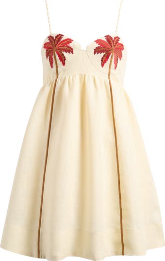 Vibrant palm embroidery frames the sweetheart neckline of this breezy babydoll dress, while contrasting trim traces the front of the dress for an elongating effect. The airy, lightweight feel adds playful movement for sunlit afternoons and warm nights.