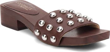 Polished dome studs highlight the single faux-leather strap of this slide sandal that goes for a retro look with a square toe and boho wood-grain block-heel sole.