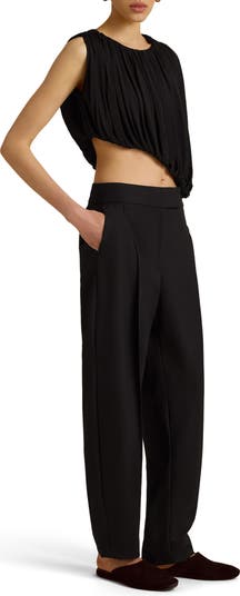 Punctuated by their cocoon-shape, these trousers rendered in our virgin wool tailoring are an essentail addition to the modern woman's wardrobe. Worn with the Belted Boyfriend Blazer or the Jersey Draped Top, this new trouser silhoeutte embraces seasonless day-to-evening dressing.
