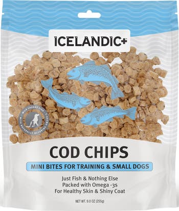 ICELANDIC+ MINI FISH CHIPS: COD - 9OZ - With our Mini Cod Fish Chips, you can treat your dog to a crunchy, all-natural snack that features just one ingredient—pure Icelandic cod (no additives, no preservatives and no supplements). They’re caught daily in the icy-cold waters of Iceland and are processed immediately for freshness you can count on without a heavy fishy smell. A rich source of Omega-3 fatty acids, these delectable dog treats promote healthy skin and a shiny coat. They also offer dental benefits, reducing tartar and plaque build-up for healthier gums and teeth. With a single source of protein—100% natural and edible Icelandic cod—these tasty treats are easy to digest and ideal for dogs with food sensitivities. The Mini Cod Fish Chips are a small bite and the perfect size for training or small dogs. These are the perfect training treat - they fit in your pocket and don't crumble or turn to mush like other treats. No flaking or breaking or falling apart. They are also the perfect tracking treat and while not an overpowering smell, the dogs go nuts for them. - D. Owens who is a Dog Trainer for 27+ years and thousands of obedient dogs, trainer for TV and Film, police dogs, show events, and a trainer of dog trainers.