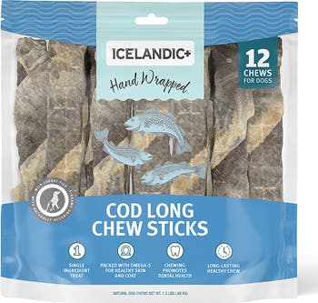 ICELANDIC+ HAND WRAPPED COD SKIN LONG 10" CHEW STICKS: A Masterpiece of Flavor and Quality Each 10" chew stick in the Icelandic+ Hand Wrapped Cod Skin Long Chew Sticks collection is a masterpiece of artistry and flavor, meticulously crafted in Iceland. These aren't just treats; they're a testament to craftsmanship and taste that elevate your dog's snacking experience. Made from a single ingredient - pure cod skin sourced from Iceland's pristine waters - these treats contain no additives, preservatives, or supplements. Your dog will relish peeling away the layers of cod skin to uncover the hidden goodness within. These tasty and healthy treats are suitable for dogs with protein sensitivities, and they provide peace of mind as they meet strict standards and regulations, including those set by the FDA, USDA, EU, and MAST. Beyond satisfying your dog's taste buds, these chew sticks promote gum and teeth health while enhancing skin and coat quality. Plus, they serve as a natural source of Omega-3 fatty acids, contributing to your pet's overall well-being. Icelandic+ Hand Wrapped Cod Skin Long Chew Sticks are a unique fusion of craftsmanship and flavor that takes your dog's snacking experience to a whole new level. Your pets benefit from our Icelandic pet treats’ higher levels of nutrients and the absence of chemicals like pesticides, herbicides, and other toxins.