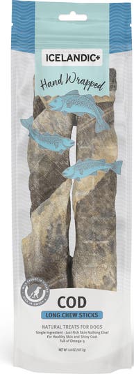 100% Pure Icelandic+ Cod Short Chew Sticks. Yes,these are Hand Wrapped, by incredibly skilled and knowledgeable craftsmen in Iceland. Each 5" Chew Stick is unique and shows the Artisan Craft that it takes to make these distinctive and sturdy treats. Your pup will truly enjoy the challenge of getting at and peeling away the hidden goodness of Cod Skin within each fold. Not only are they delicious for your dog, they reduce tartar and plaque build-up in gums and teeth! They are caught fresh daily in the cold, pure waters of Iceland, and air-dried. Plus, since these treats feature just one protein sources, they’re a smart choice for dogs with food sensitivities.