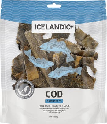 100% Pure Icelandic+ Cod Skin Strips Dog Treats. Our 100% natural and edible Icelandic Cod Skin Fish Strips are single ingredient and contain no additives, preservatives or supplements. They come only from the pure icy waters of Iceland and are line-caught daily and processed immediately. Not only are they delicious for your dog, they reduce tartar and plaque build-up for healthier gums and teeth. They are also a great natural source of Omega-3 & Omega-6 fatty acids, promoting healthy skin and coat for your pet. With just one ingredient, these tasty and healthy treats are perfect for dogs with protein sensitivities. Our natural and edible fish products offer peace of mind, as they are cleaned and air-dried within FDA, USDA, EU, and MAST standards and regulations. Because Iceland almost never gets warm, our fish always remain cold after being caught. As a result, they have less smell than other fish treats in the market. For freshness and convenience, our fish are packaged in a resealable bag. Each package contains net wt. 16.0 oz. of Icelandic+ Cod Skin Strips.